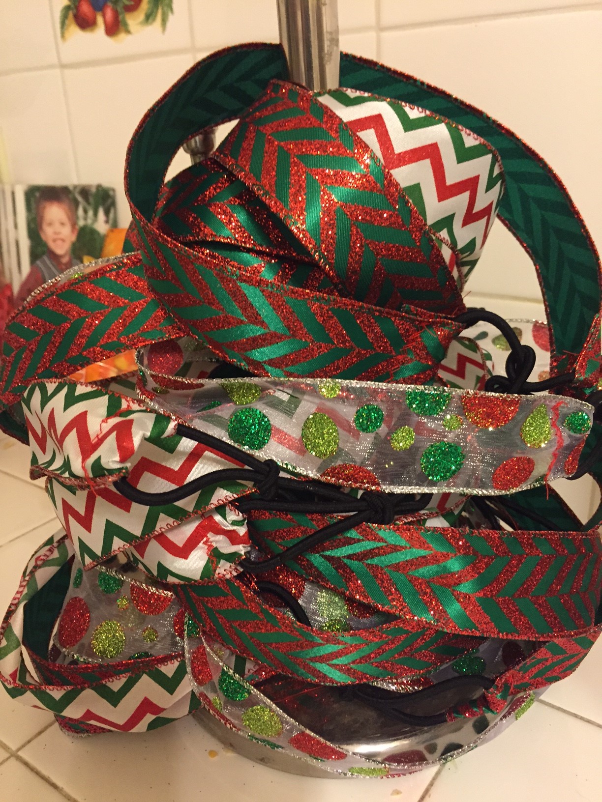 So I scrapped that idea and grabbed a couple rolls of glittery Christmas ribbon that was 60% off and hit the check out stand. I will never be too old for glitter.