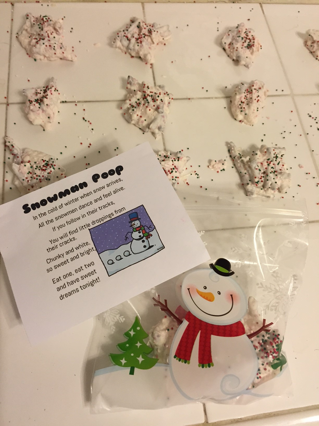 I didn’t mean for my creation to look like white poo. They just did so I rolled with it. I stole and then modified a poem I found online and taped it to a bag with three or so blobs in it.