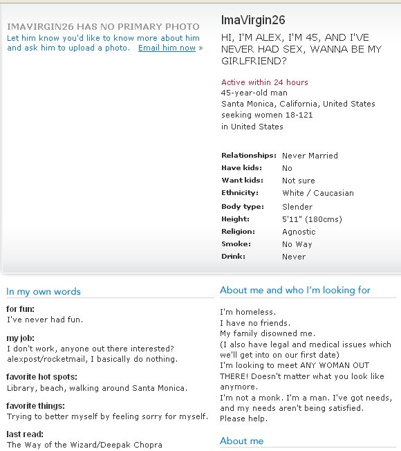 Some people are dipshits. There isn’t a word in the English language that is better suited for them … DIPSHITS. For example the a**holes that sat around and decided to put together the profile above and send me a wink. The only thing truthful about this profile is that the person(s) live in Santa Monica. There is a large concentration of dipshits in Santa Monica. This isn’t an opinion. It’s a fact. Ask anyone. Dipshits.