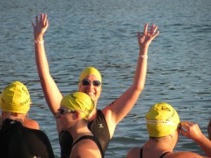 When my wave hit the water I was really excited. Then I IMMEDIATELY freaked out. That is pretty common. I train in a pool and hitting a lake where it is murky and I can’t see under water while being kicked by other women tends to throw someone off their game. I told myself I could “freak out” until the first buoy and then I had to pull it together. So that is what I did. After the first buoy I was good to go and swam my little heart out. Not fast but steady. My theme.