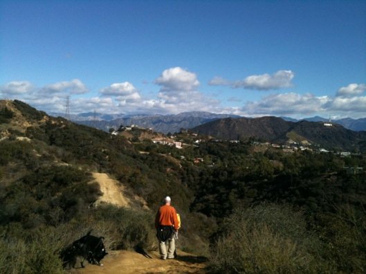 The cold followed me back to LA so I was bundled up and the wind was crazy. At the top of the spine I stopped to put my sweatshirt back on and nearly got blown back down the hill! The wind made for super clear skies though! It was beautiful. You could see for miles in all directions! Blue skies. No smog. Just pretty LA! Riggins and I took our time so we could look around. Notice the picture. PRETTY PRETTY PRETTY + Riggins re-marking what he considers HIS hill!