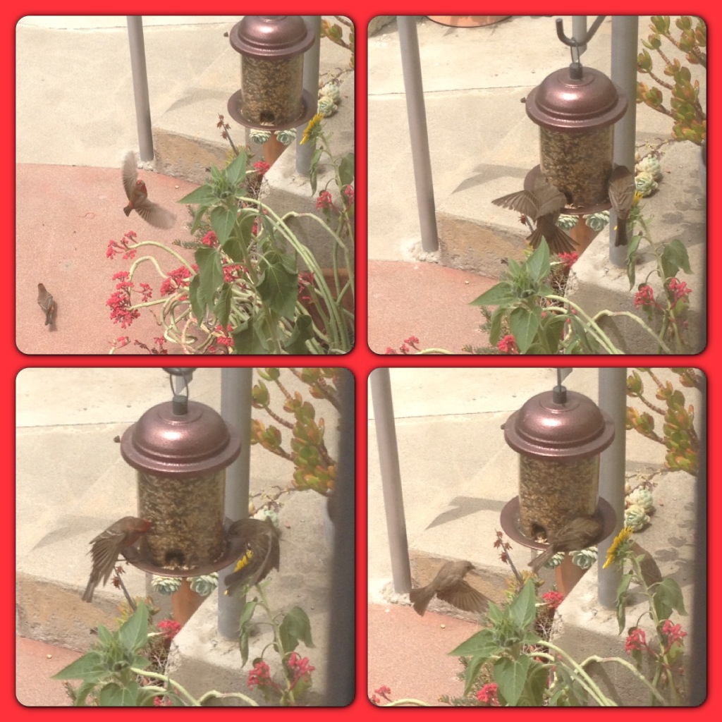 I have a bird feeder stuck in the biggest flower-pot. It’s been there for years and I fill it up with food for the birds to come snack on. The thing about bird feeders is it takes awhile for our feathered friends to find them but once they do BACK OFF! They won’t stop eating until every last seed is gobbled up. My front porch is a 24 hour smorgasbord for a gaggle of beautiful red-headed/breasted birdies.