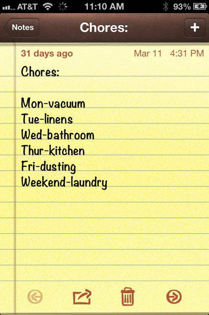 Back to me. I’m no good at dedicating an entire day to cleaning. It just isn’t going to happen and that only keeps my house clean for a day or two so what is the point? Pinterest to the rescue (as always). I found lots of suggestions on Pinterest on how to do a chore a day so that you have a rotating cleaning schedule. I thought I’d give it a shot. To keep my chore list close to me and top of mind I put it on my phone. I’ve been doing it for a few weeks now and I’m sold! My house is never super-duper crazy clean but it is always tidy and clean enough! Of course I cheat and skip a day or two. Honestly I’ve only dusted once because dusting is boring. I could bump my vacuuming up to two times a week but that isn’t going to happen. I do have a few time-saving tips that I’m happy to share: