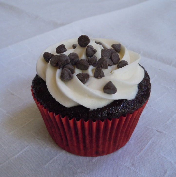 A few months ago, I came across a quirky little recipe that was supposedly created during the great depression. It requires no eggs, no milk, and no butter because those items were rationed at the time. I tried the cake recipe and it wasn’t bad. On top of that it was ridiculously easy. I tweaked it here and there, adding more chocolate and more sugar. It was pretty darn good but it didn’t become THE CUPCAKE until I added chocolate chips. Wow! The chocolate chips made this cupcake a winner! It’s super-chocolaty, almost brownie-like. I pair it with a homemade vanilla frosting but it’s delicious even without the frosting. It’s a big hit, with everyone except Josh that is. He doesn’t like chocolate! I know, what? I’m experimenting on a lemon cupcake for him now. I’ll let you know how it works out.