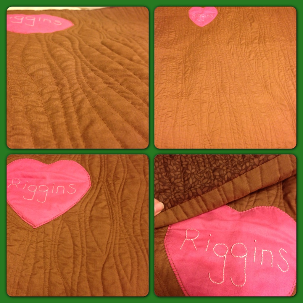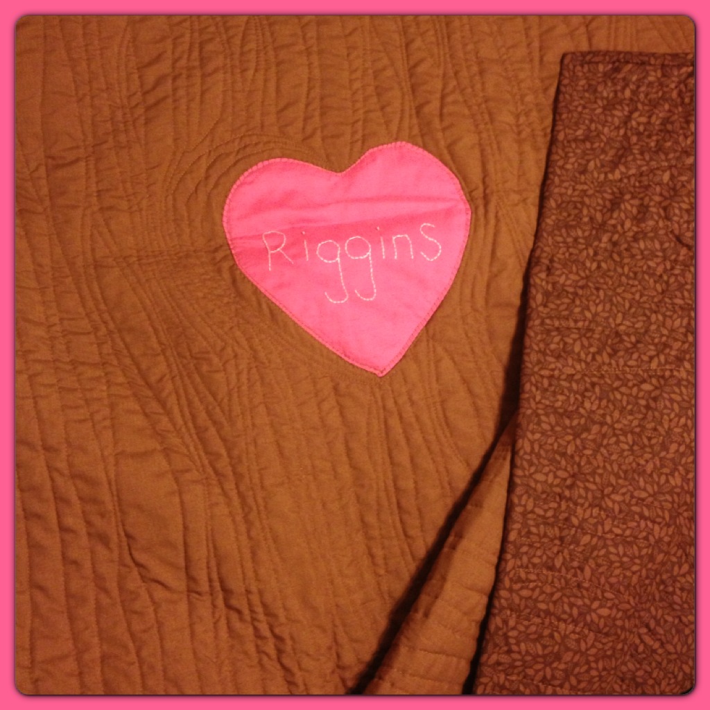 When I showed my mom a picture on Pinterest of a quilt I liked she decided I should make it. At first glance it seemed pretty easy, for a quilt, so a perfect project for a novice quilter. There wasn’t really a pattern but the overall look was a tree bark that had a heart and initials “carved” into it. Of course it was a no brainer that I would change the initials to “Riggins.” (The original Pinterest poster now makes these on request. You can purchase at her Etsy store. Although I think it is kinda weird to have a stranger make something so personal for you it isn’t a bad price. You’d have to pay me closer to what Demi Moore’s character was offered in Indecent Proposal to make this again.) A trip to JoAnns yielded the perfect fabric including material for the back/binding that had brown leaves all over it. (We didn’t purchase enough and my mom was nice enough to go back and get more so I’d have enough strips to make the binding.)