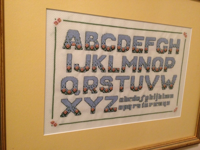 Today when I say sampler I am referring to a needlework pattern that contains the alphabet and sometimes numbers (Although I’d consider a “Home Sweet Home,” “Home established …”, or other such sayings samplers as well). My mom made the sampler that hangs in my entry way right now. This is its third house/apartment it has been hung up in and I love it. A handmade sampler, to me, is a symbol of a loving and happy home.
