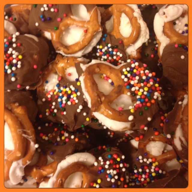 Place a layer of pretzels on a covered cookie sheet. Place 4 mini marshmallows on top of each one. I got bored and started just putting 3, one in each pretzel hole. 4 is better. It gives the top pretzel more to stick to. Place the sheet in an oven (350 is what I did) until the marshmallows get all puffy and sticky. It won’t take long. Grab some more pretzels and smash one onto each marshmallow pretzel pillow. Melt some chocolate melts and then grab each pretzel sandwich and dip it in. For fun and color add sprinkles before the chocolate sets up. Stick in the fridge before packing to take to your party.