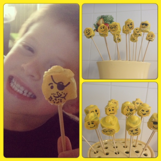 At this point the balls are done! Ta Da! If you went crazy and decided on making Lego heads then grab an edible pen and draw on some faces. If you are me the edible pen you bought is crap and won’t work. As a last-ditch effort I grabbed some yellow scrapbooking paper, drew some faces, cut them out, and “glued” them to the pops (using chocolate).